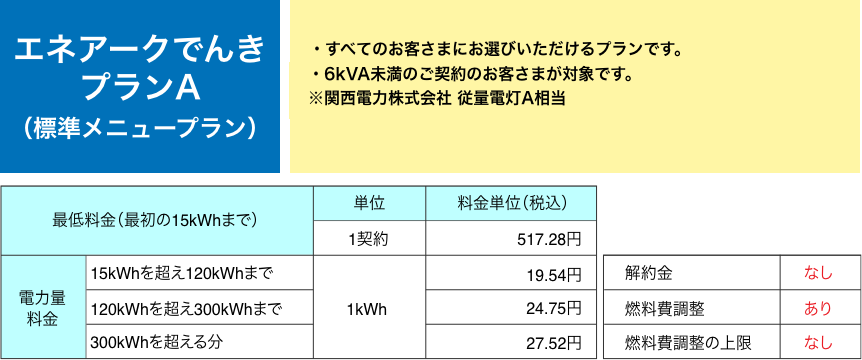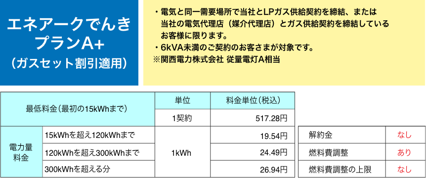 - プランA+をご契約のお客様が、当社が定める適用条件を満たさなくなった場合には、 プランAに変更となります。その他当社が定める適用条件及び適用廃止条件の詳細については、 電気料金メニュー約款(PDF)をご参照ください。